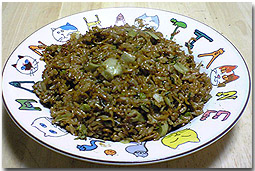 あとはご飯とレタスと一緒に炒めて、焼きそばソースで適当に味付け。ネギと青海苔をパラパラ。