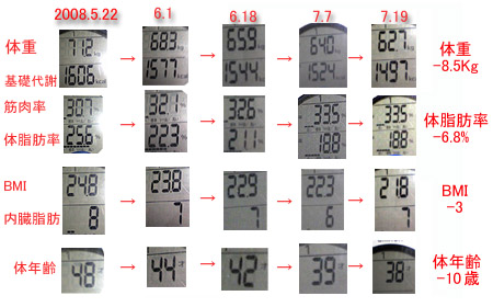 それにしても、今回は基本的に低GI系のダイエットということで、炭水化物もそこそこ摂取したし、夏だけにビールも週2回は飲んだし(量は350ml~500mlに規制!)、アイスクリームも甘いものもストレスたまらない程度にとったおかげで、内臓脂肪の減り方はゆるやかでした。ちなみに、我が家の体脂肪計はタニタの初期型で、内臓脂肪は30段階表示で、10以下が正常範囲ということになってますから、まあ落胆するほどではなさそうです。でも、前回は「3」までいったので、やはり今後の目標は体脂肪率と内臓脂肪っちゅうことですね。体重は前回のように59kgを切ったりしたら痩せすぎなので、60-62kgくらいを維持できるように運動量でコントロールしてみます。