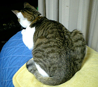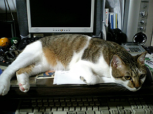 来た頃はデスクの上に乗っかっても仕事の邪魔にもならなかったタロウですけど、今じゃコレです。あの・・・モニターが見えづらいんですけど・・・。