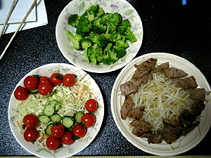 肉は良しとして、大量のもやし、大量のブロッコリー、キャベツ、きゅうり、ミニトマト。