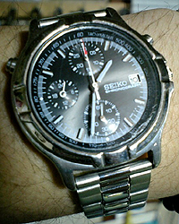 忘れもしませんが、この時計、知り合いのとこから、いわゆる社販のような形で購入したんですが、来た翌日にクロノの針が脱落(^^;) かなりの衝撃を受けたことがあります。こういう経験ってもう一生忘れないでしょうから、やはりモノ創りに携わるメーカーは、よくよく心して仕事する必要ありです。この当時の製造ラインが日本国内なのか、それとも中国その他アジアの国なのかはわかりませんけど、その後交換品としてやってきたこの時計は、まあそれなりに壊れることもなく、何度かの電池交換も無事乗り越えて、現在も稼動しています。ただし、あまり言いたくはないけど、つい一ヶ月前にはクロノのプッシュボタンが脱落しました(^^;)(^^;)(^^;) まあ、何事もなかったように押し込んで回したら、ネジ締まって直りましたよ、ええ、ええ。