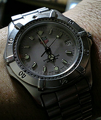 この時計を購入した当時はまだ毎日腕時計を替える習慣もなく、かなりヘビーに使い倒しました。釣りに行くのも、温泉つかるのも、海で泳ぐのも。クォーツなので2年くらいで電池交換ですが、ずっと自分でやってます。防水性能は確実に落ちてます(^^;)
