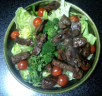 炭水化物抜きの右写真のような食事を3ヶ月は続ける。(これは肉山盛りでダイエットメニューの中でも一番のご馳走。基本、豆腐とか、チーズとか、野菜です)