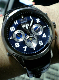 フルカレンダー(月・曜日・日付)にサン&ムーン表示。50M防水に、革ベルト(Dバックル付き)、裏はスケルトンで、綺麗なムーブメントが見えます。はとちゃんが好きな、安物中華ムーブとは一線を画したホントに綺麗なムーブです。またの機会に裏はお見せします。