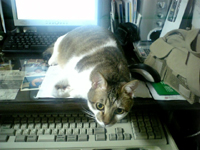 それが気に入ったのか、いつもはとちゃんにまとわりついて、仕事中はデスクの上に飛び乗って、モニタの前にゴロン。