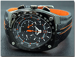 アナログとはいえ、1/5秒クロノグラフを搭載した盤面は、どう見ても時計表示よりクロノ表示を優先させてます。