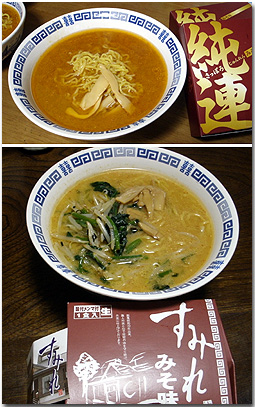 味はどれも味噌。麺は縮れ麺ですが、太さが微妙に違いました。一番太かったのは純連、すみれは普通、残りふたつは細かった。