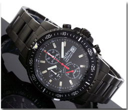 クォーツ、100m防水、、クロノグラフ(1/10秒、1/1秒、30分積算計)、日付カレンダー、蓄光(針、インデックス)、スイス製